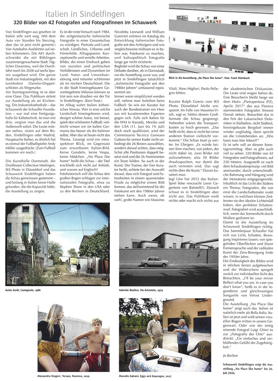 Am Sonntag, 1.2.2026 um 11.30 Uhr eröffnet die Ausstellung "NO PLACE LIKE HOME. Italienische Fotografie seit den 1980er Jahren" im SCHAUWERK Sindelfingen. Mit 42 beteiligten Künstler*innen und 330 Werken gilt die Ausstellung als legitimer Nachfolger der gefeierten Schau "Viaggio in Italia" aus dem Jahr 1984.